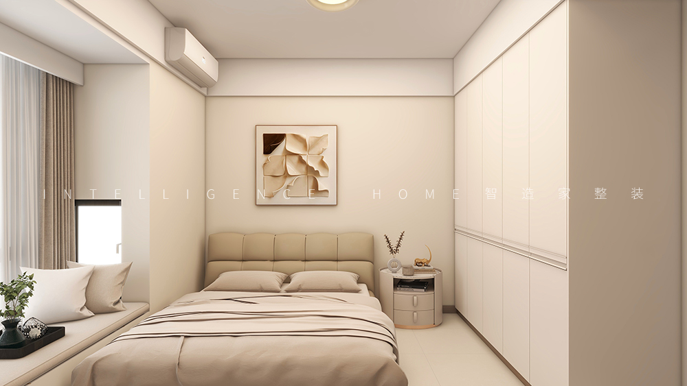 此房为三房1卫的户型,常住一家三口人。男主人周末休息喜欢玩电竞,北卧室主要作为电竞房,兼客房使用。小孩房需要考虑储物以及书桌功能区的使用,便于小孩上学后有单独的空间做功课。全屋通铺柔光砖,整体色调明亮清爽。